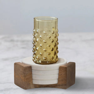 Coasters are a must in every home today. These white marble coasters will add extra spice to the room decor while also protecting table surfaces. Place in accessible areas near where people sit eliminating the need to worry about water stains and scratches. Comes as a set of four coasters with mango wood holder.