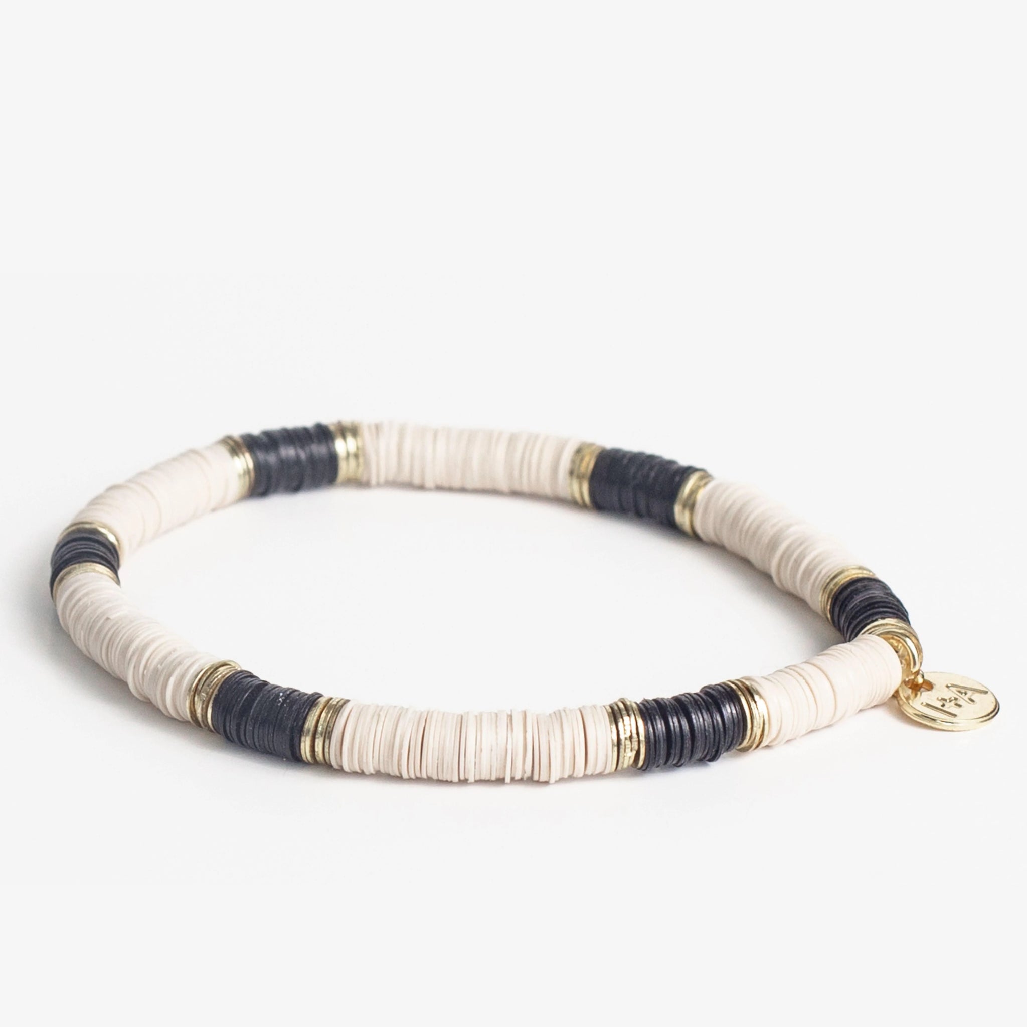 Mix + match, layer + stack with a great neutral black and cream stretch bracelet.  This sequin beauty is handmade with love + pops of shiny gold for an effortlessly cool vibe that goes with anything.
