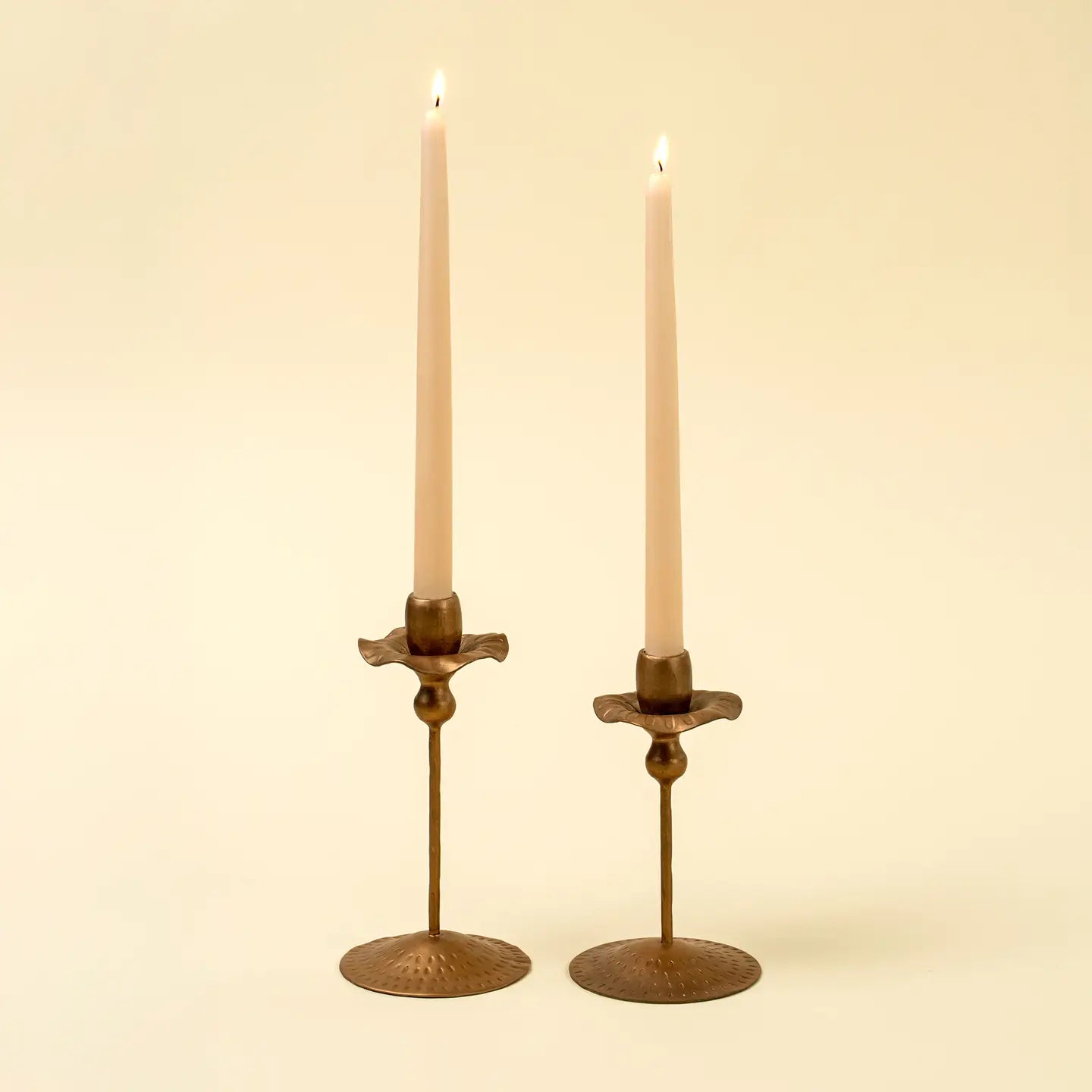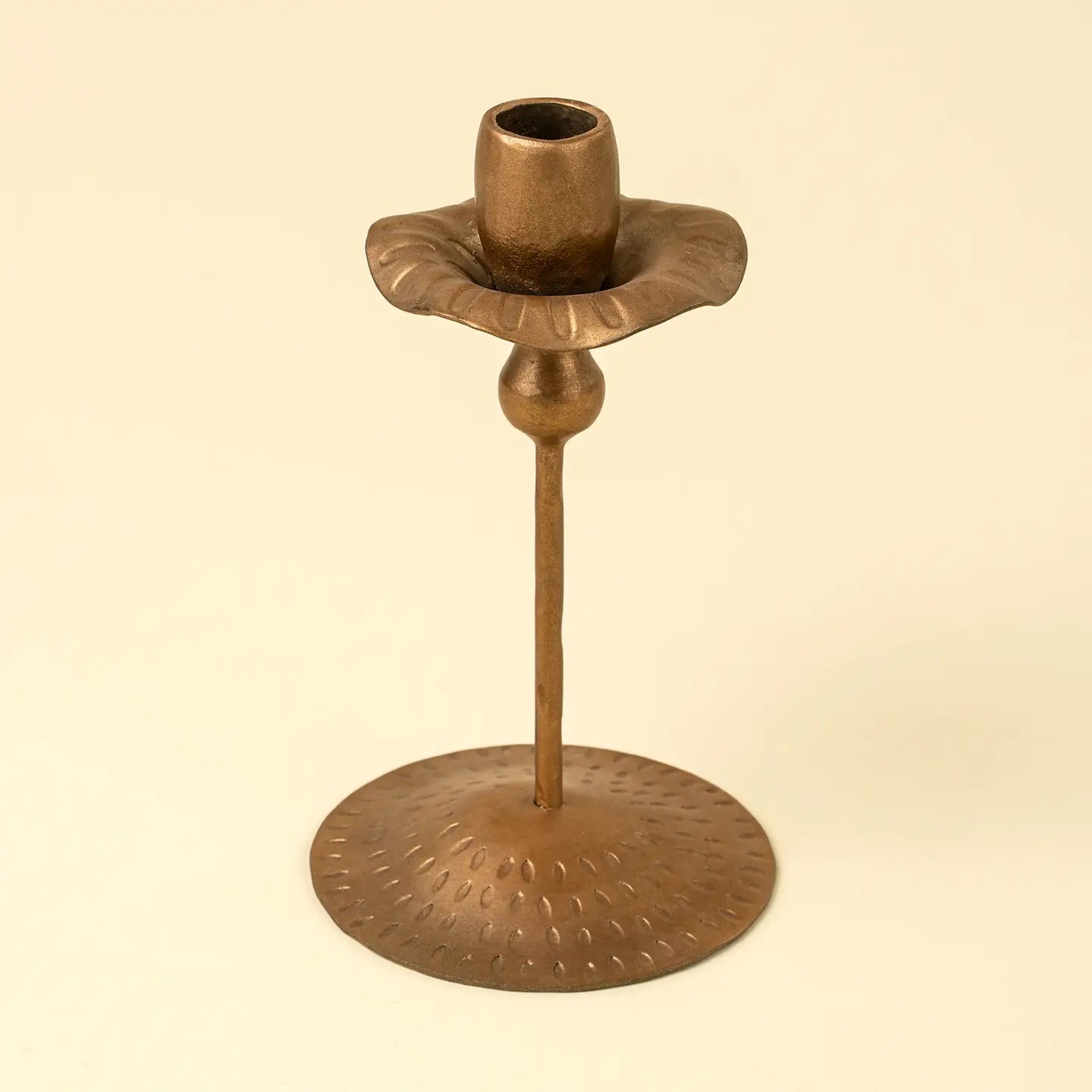 Celebrate spring and elevate your table or mantel with the Tulip Candlestick, a handcrafted piece that blends traditional crafting methods with sculptural style. Made from 100% iron and finished with a warm brassy patina, this candlestick features a floral-inspired form with delicately carved details. Its tulip-like shape and subtle texture bring soft elegance to any accent decor arrangement.