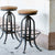 This industrial-style factory stool features a reclaimed wooden seat, strong metal construction, and adjustable height.