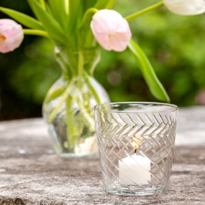 Illuminate your space with a votive using this beautiful etched glass tumbler vase. It is sure to add a warm glow. Use alone or in multiples for greater impact.