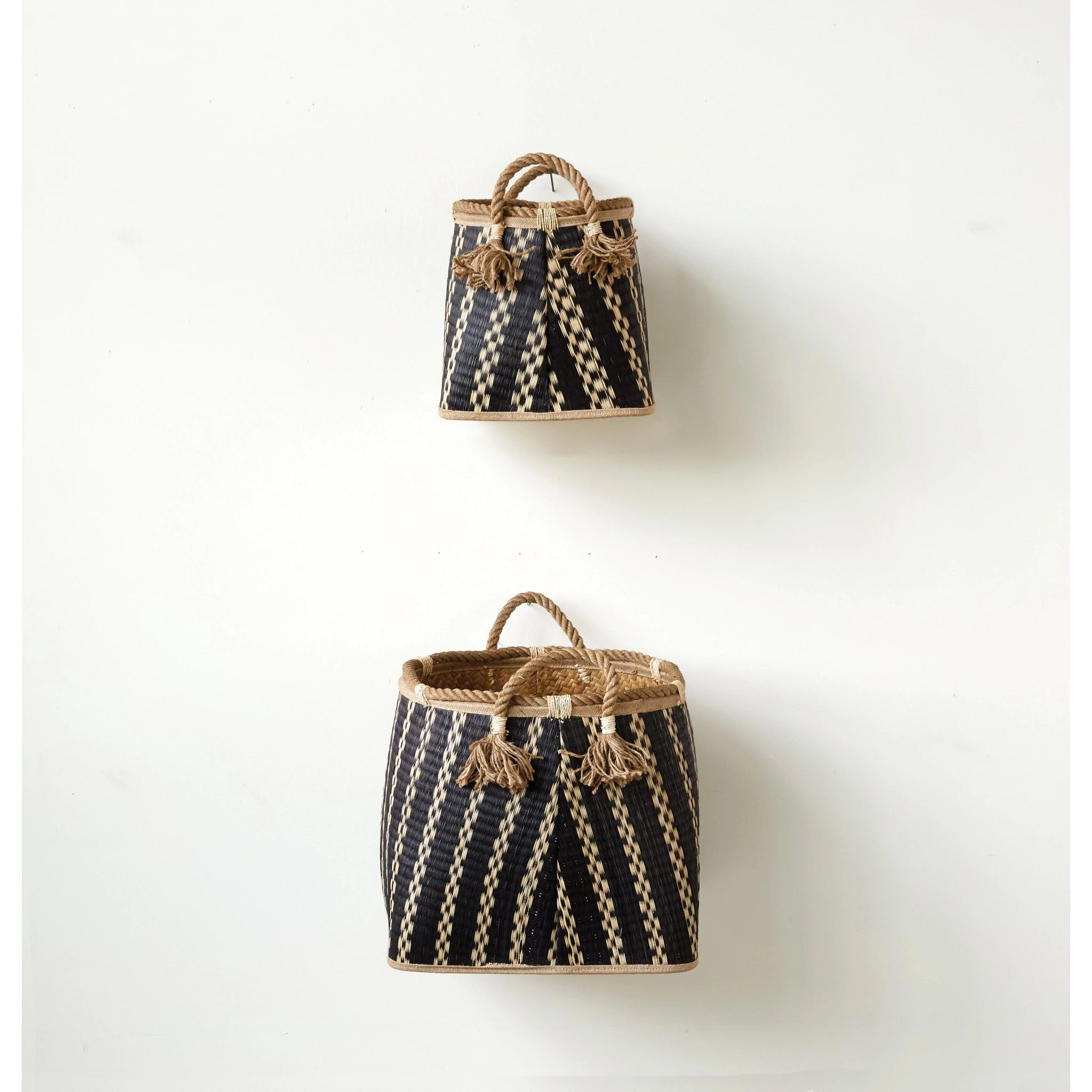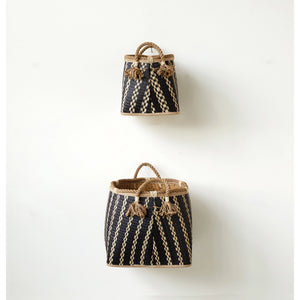 Elevate any home with these woven baskets that bring a mid-century or modern touch. Not only are they the perfect basket to hide crafts, toys and throw blankets, they strike an architectural note with geometric pattern of black and natural. Adorned with a rope handle for easy toting and convenience.