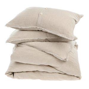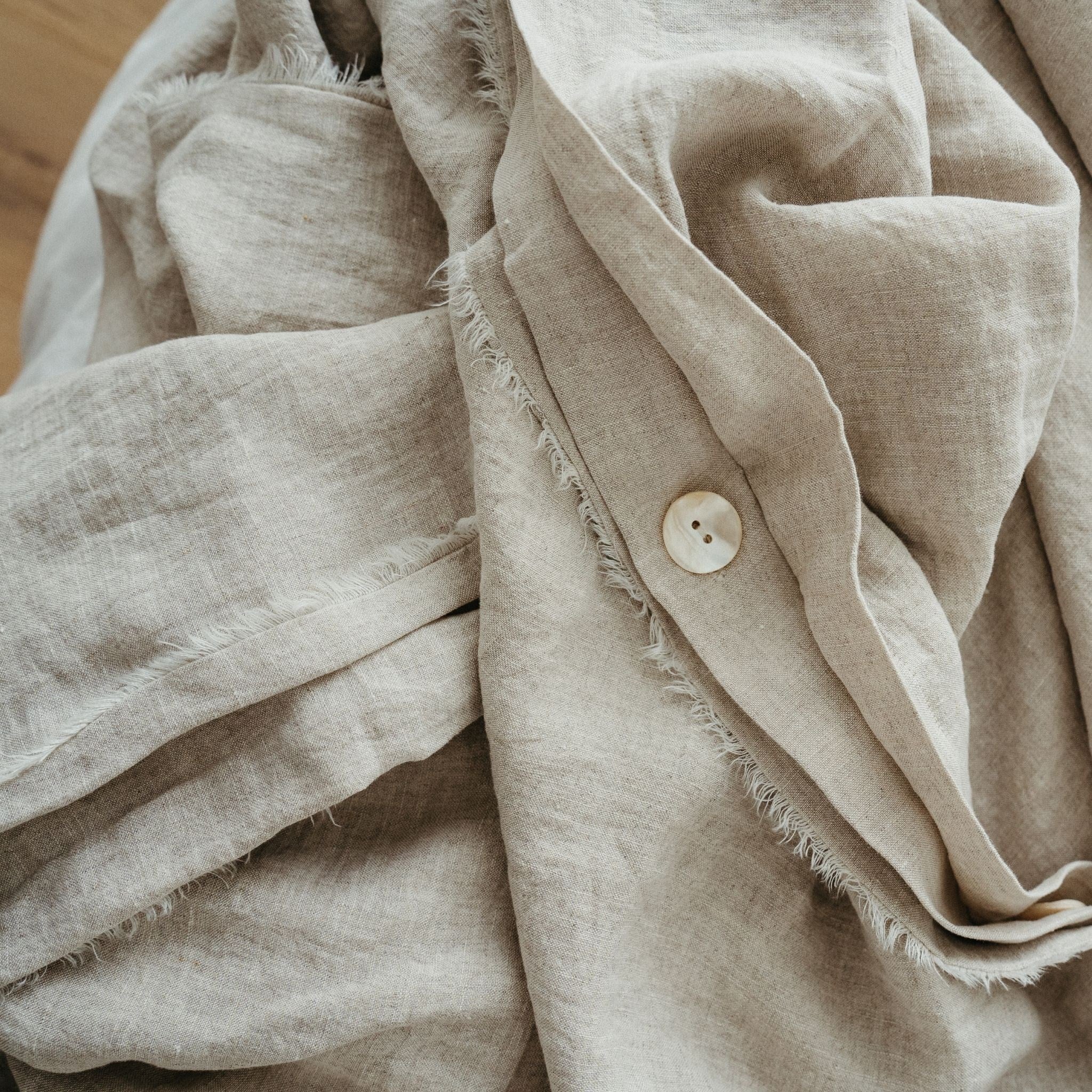 Unwind, decompress, and focus on me-time with the Lina Linen Duvet Set. Each set is made in India from 100% linen woven from Belgian and French flax, a material we love for its effortless luxury, relaxed look, sustainability, and breathability - it only gets better with time. They are pre-washed for softness, durability, and relaxed feel. Each set includes one King duvet cover and two King pillow cases and features include frayed edge, mother of pearl button closure at edge of duvet cover and back of pillowcases, internal ties, and a spare button. Sets are packaged in matching linen bags with frayed edge patch describing contents.