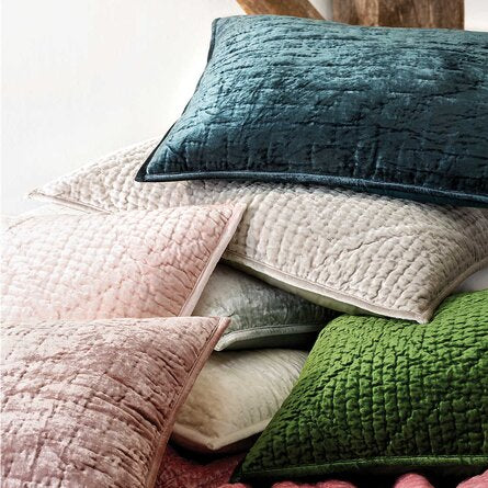 Love at first touch, you will melt at the hand feel of this sublimely soft-to-the-skin scrumptious sham. Relaxed and inviting, double diamond Kantha quilted cotton velvet reverses to a matching solid back. Layer on the romance, with velvet for every season.