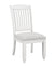 French country design comes together with contemporary touches in the Centerville collection. The poplar wood is given an antique white finish with a pop of geometric detailing to the legs. The fresh look of Centerville will brighten your morning and anchor your evenings.  Chair seat is covered in a light gray and cream stripped fabric.