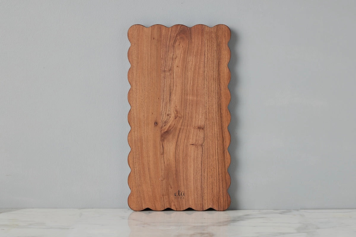 Discover the perfect blend of modern style and whimsical charm with this rectangular scalloped cutting board. The unique scalloped edges add movement and subtle femininity while the natural acacia wood grain adds texture to your countertop. With its trendy design, this functional piece of art will become a staple in any kitchen.