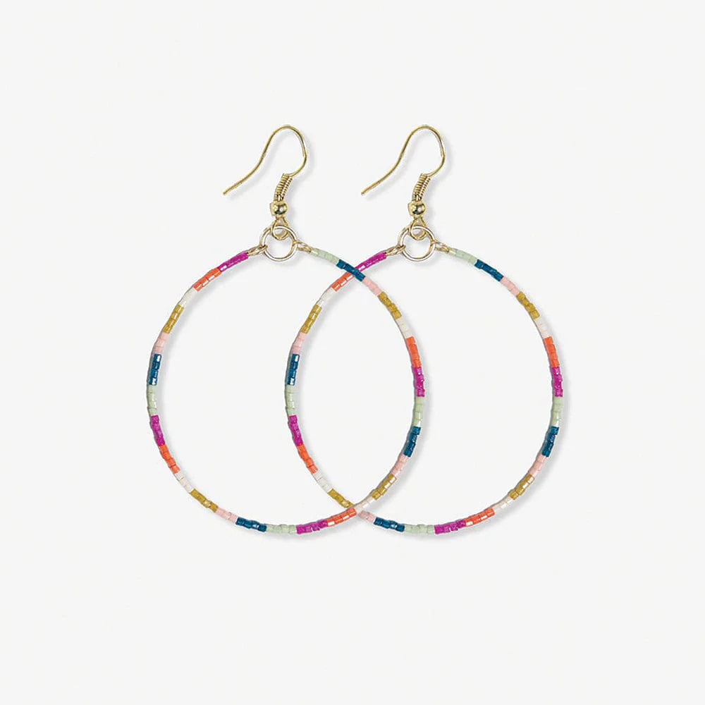 Lovers of bold and happy earrings, these are for you! Lightweight, dainty, yet impactful, these front-facing hoops are what everyday earring dreams are made of. This slender silhouette of glass beads in world-famous rainbow colorway will become your new go-to accessory for a pop of outfit fun!