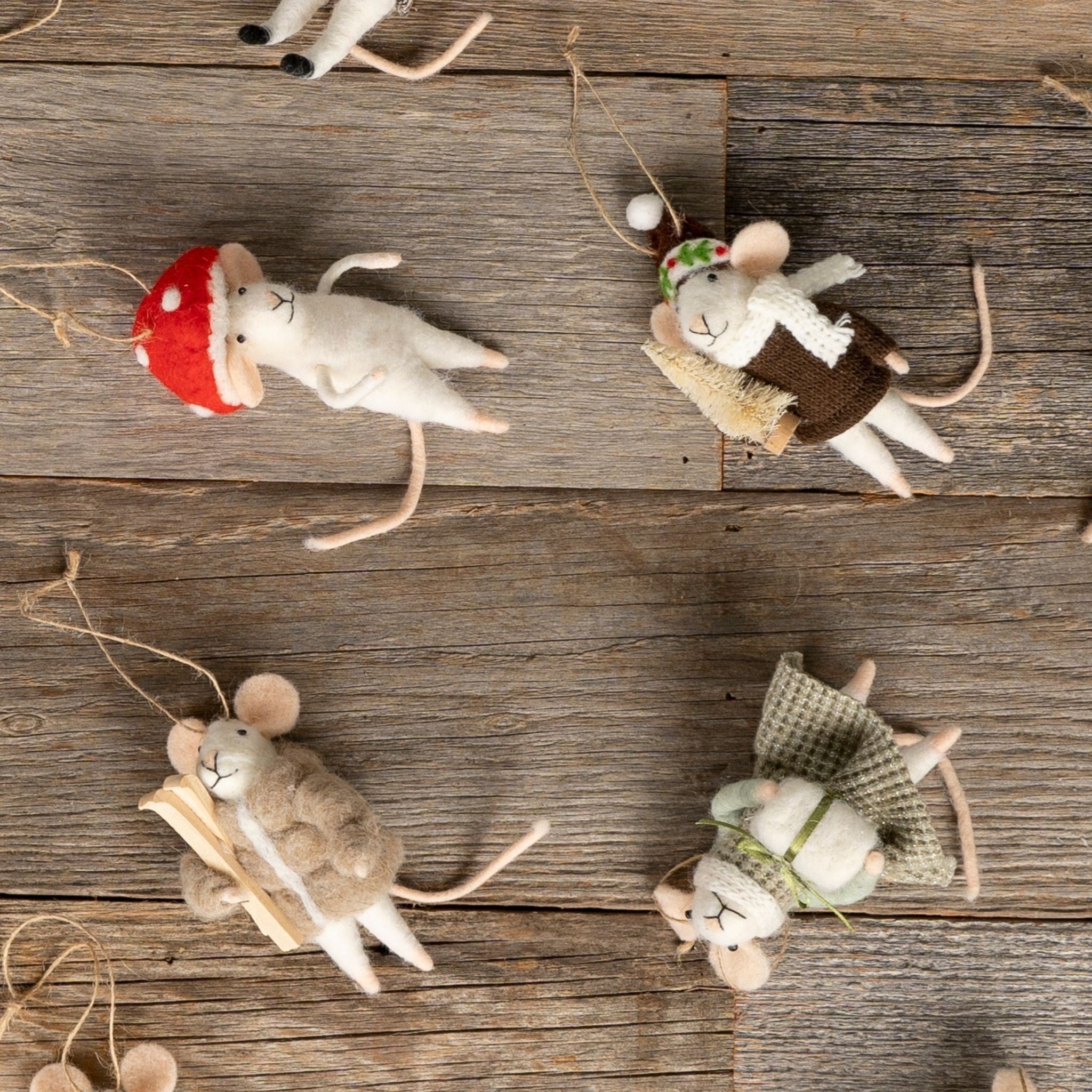 Woodland whimsy to your holiday decor? Yes please! These adorable mice are made from soft wool/polyester felt and dressed in adorable outfits. These cuties are charming hung on a festive tree, on wine bottles, or sitting on the shelf supported by their wire tails. Collect them all this holiday season.