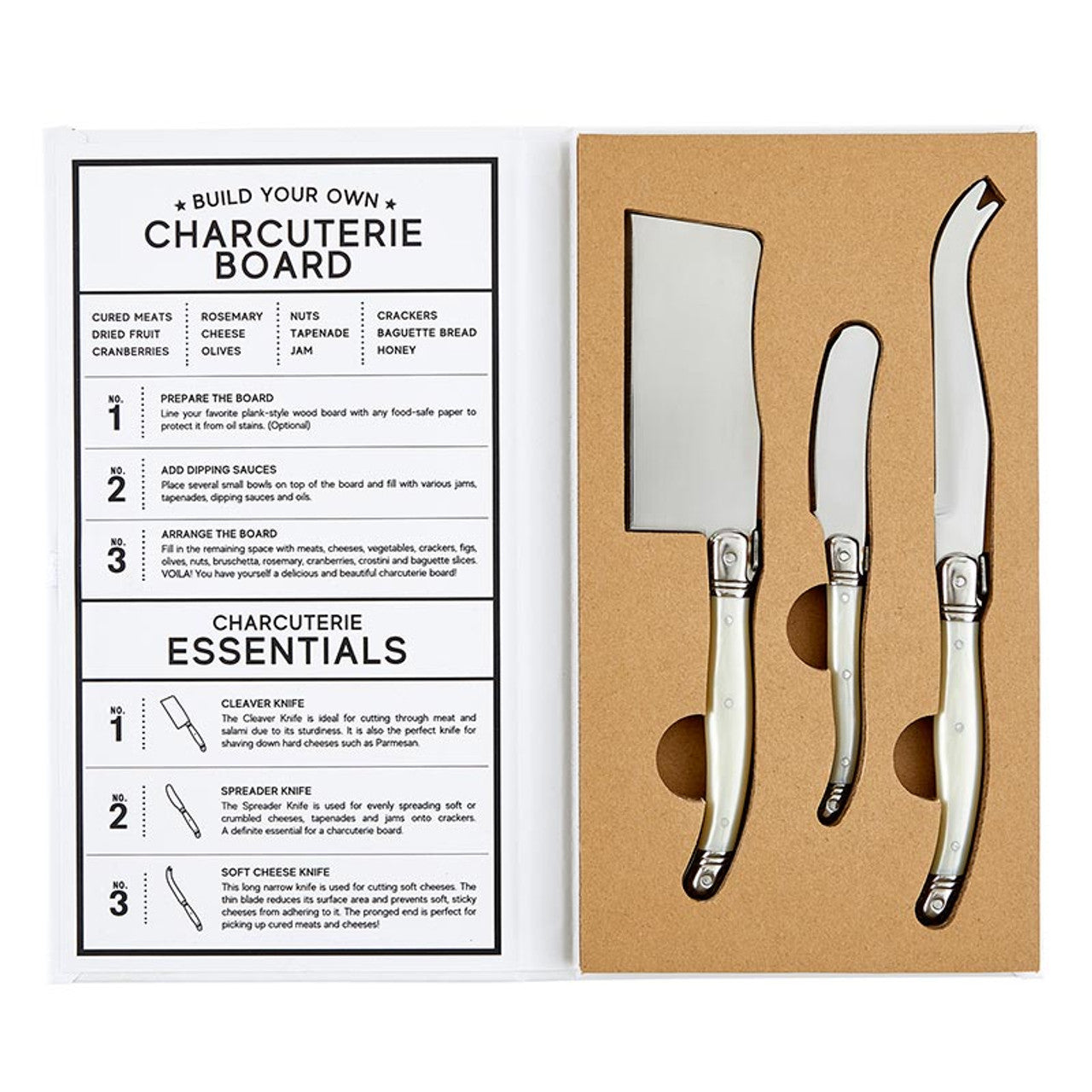 Gift these pearl-handled charcuterie spreaders to your favorite hostess or maybe even yourself! Four spreaders come in a gift box featuring modern typeface and a Charcuterie Essentials guide.